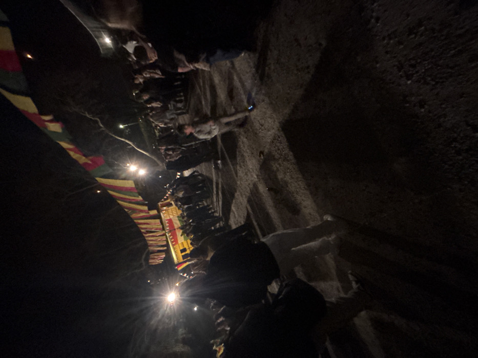 The image displays an outdoor nocturnal scene in Heilbronn, Germany, depicting a public gathering. Numerous individuals are present, forming a dense crowd that extends from the mid-ground into the background, with their specific features obscured by distance and low light. Overhead, multiple strands of rectangular bunting, patterned predominantly in red, yellow, and green, are strung across the frame. In the mid-ground, a bright yellow booth or structure is visible, topped with a red and green striped canopy. In the mid-right foreground, a young male child is discernible, wearing light-colored clothing. Luminous blue elements are observed near the child's feet. On the unpaved, dark ground in the mid-foreground, several discarded items, consistent with beverage containers, are present. Artificial light sources, including a prominent bright light on the far left, illuminate segments of the scene and cast elongated shadows. Silhouetted trees are visible against the dark night sky in the background, indicating an outdoor, possibly park-like, environment.