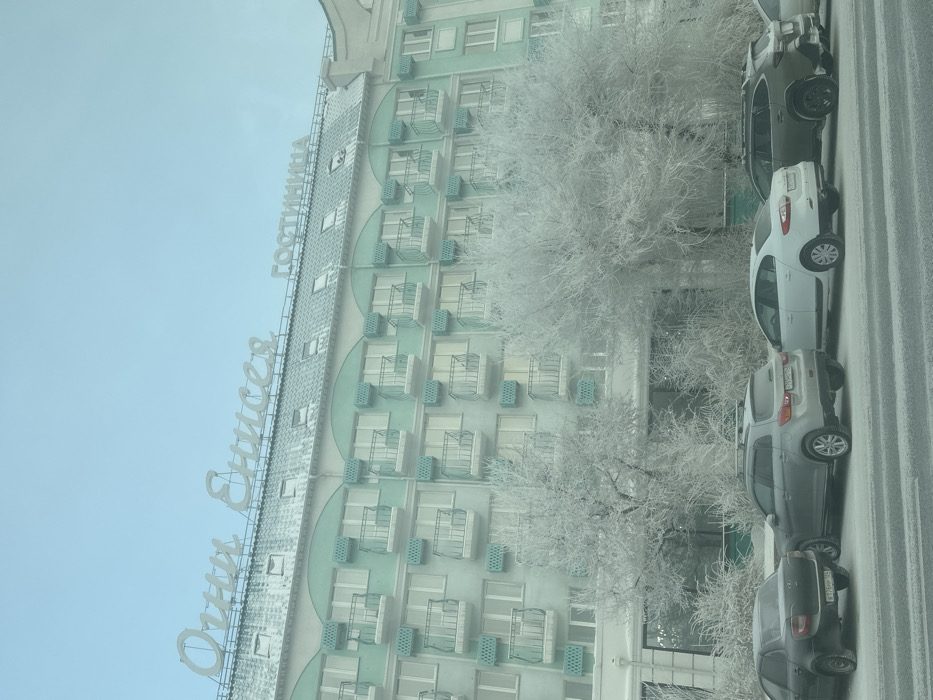 A tall, light green building with many windows and balconies is seen from a low angle. The building's name is displayed in Russian vertically on its side. A row of parked cars lines the street next to the building, separated by snow-covered trees. The sky is overcast, lending a muted tone to the winter scene.