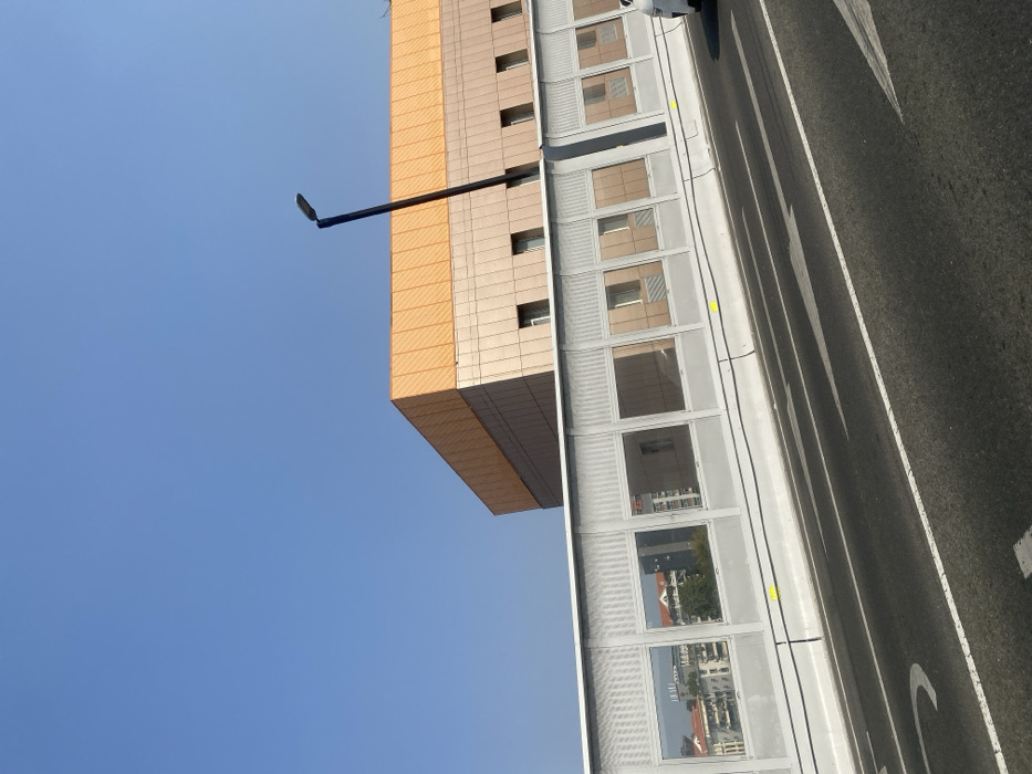 A building with a light tan facade and dark windows rises against a clear blue sky. A modern street light extends from the building's side. An elevated gray structure with reflective windows runs adjacent to the building, reflecting urban scenes. A road with white painted markings is visible on the right, suggesting an urban or highway environment. The image is taken from a low angle, emphasizing the height and scale of the structures.