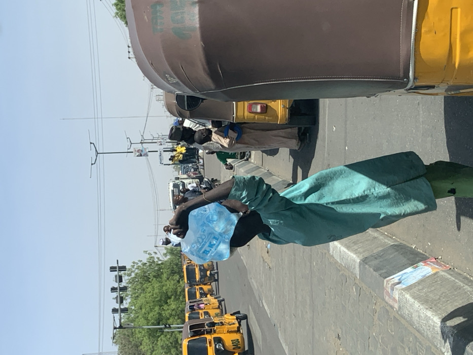 This image captures a bright, sunny street scene in Hotoro South, Nigeria. In the foreground, a person, dressed in a teal long-sleeved garment and green trousers, walks on the edge of a paved road next to a concrete barrier. They are balancing a translucent blue plastic container, labeled "B.K.L. 500," filled with a clear liquid, likely water or ice, on their head. Their right arm is raised, with the hand near the container, seemingly providing stability. To the immediate right, a yellow three-wheeled auto-rickshaw (keke Napep) with a brown canopy, bearing the marking "TGT," is partially visible. Next to it, another yellow auto-rickshaw is present, surrounded by several individuals. These include an adult male in a light-colored robe and a dark cap, and a child in a similar light-colored robe, both standing near the auto-rickshaw. The background reveals a multi-lane paved road extending into the distance, with a continuous line of yellow auto-rickshaws on the left side. A traffic light system is visible above the road on the left. Street lights with multiple horizontal arms are spaced along the road, and a banner with a portrait is affixed to one of the poles. Various vehicles, including a truck, and pedestrians are observable further down the street. Green trees line the far left of the background. The sky is clear and light blue, indicating a daytime setting.