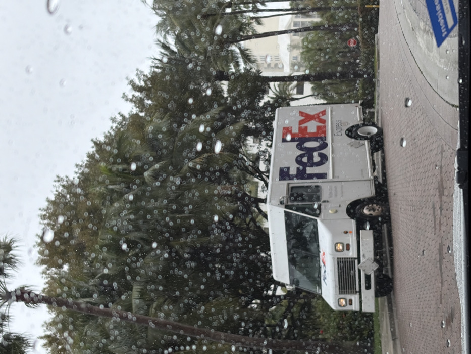 A white FedEx truck is parked on a red brick sidewalk adjacent to a street lined with palm trees. The sky is overcast and rain is visible on a window, obscuring the view. A building can be seen through the trees. The image is taken from inside a vehicle.