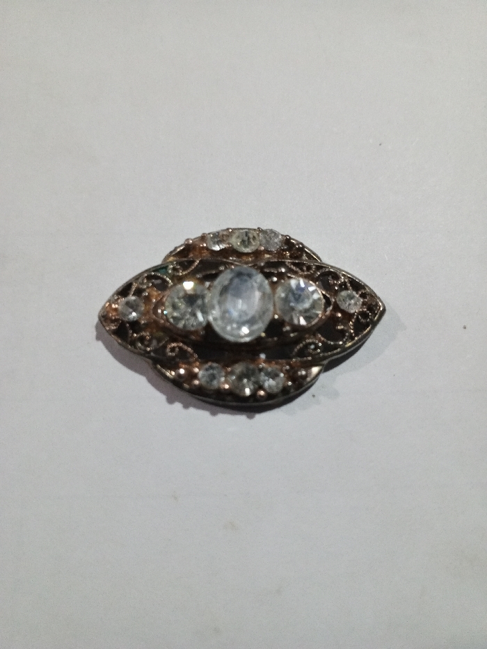 A single ornate brooch is centered on a flat, undifferentiated white surface. The brooch, horizontally elongated and approximately anhedral in shape, features dark, possibly aged, silver-toned or bronze-toned metal with intricate filigree and scrollwork. It is adorned with multiple clear, faceted stones; a larger oval-cut stone occupies the center, flanked by two smaller round-cut stones. Numerous smaller round-cut stones are embedded along the metalwork. The metal exhibits minor tarnish or patina. The background shows slight texture and minimal incidental dust. No other subjects or environmental details are discernible. The image provides no visual information to determine a specific location within the city of Phakeo, Laos.