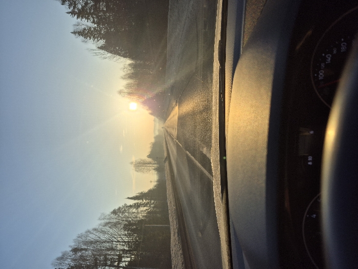 The image presents a forward-looking perspective from within a vehicle on a two-lane asphalt road in Garevaya, Russia. The scene is illuminated by a low sun, positioned to the right of the frame's center, indicating either sunrise or sunset. Intense sunlight causes significant lens flare and glare on the wet or reflective road surface and the vehicle's dashboard. The road extends into the distance, appearing slightly misty or hazy. Both sides of the road are lined with dense forests, composed of dark coniferous trees, particularly on the right, and lighter-toned, bare deciduous trees, more prominent on the left and in the far distance. The ground immediately adjacent to the road appears to be covered in frost or light snow. A utility pole is faintly visible on the left side of the road in the middle distance. The foreground is occupied by the vehicle's interior: a dark dashboard is prominent, reflecting the sunlight. A portion of a dark steering wheel is visible in the lower left. Below the windshield, part of the instrument cluster is discernible, including a speedometer marked up to 180, with its needle near the lower end, and a digital display showing "A 10". No individuals are visible in the scene.