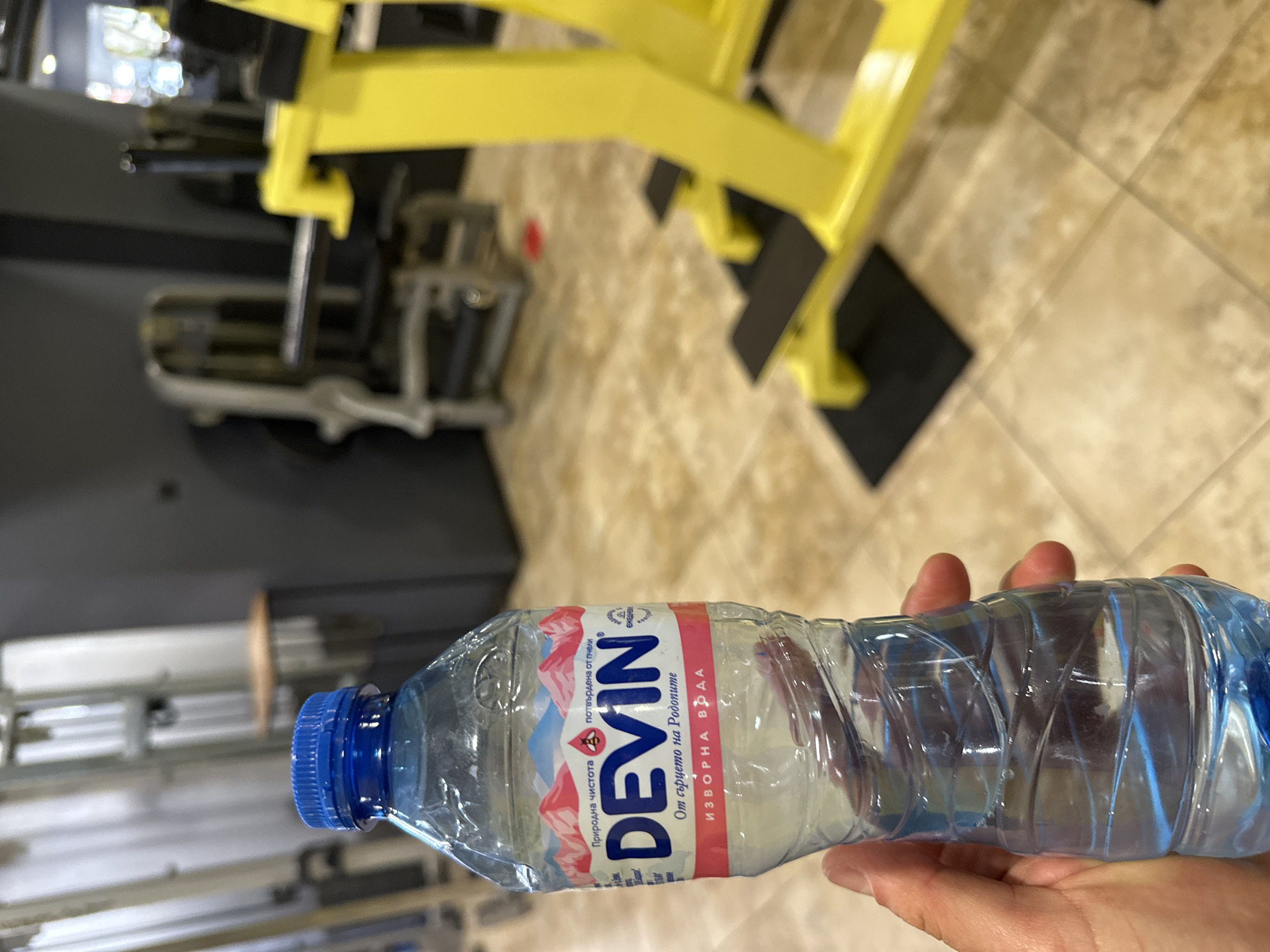 A close-up view shows a left hand holding a partially consumed, transparent plastic bottle of Devin brand spring water. The bottle features a blue screw cap and a white label with a pink horizontal band, adorned with red mountain peaks and a small bee logo. Bulgarian text on the label identifies it as "Изворна вода" (Spring Water) and "От сърцето на Родопите" (From the heart of the Rhodopes). The background, out of focus, reveals an indoor fitness facility or gym. To the right, a bright yellow-framed piece of exercise equipment, possibly a leg press machine, with black footrests is visible. Further back and to the left, several other dark grey or black weight machines are present. The floor consists of light beige or light brown square tiles. No other individuals are discernible. While the water bottle's branding indicates a Bulgarian origin, the specific location within the city of Troyan, Bulgaria, cannot be determined from the visual evidence presented in the image.