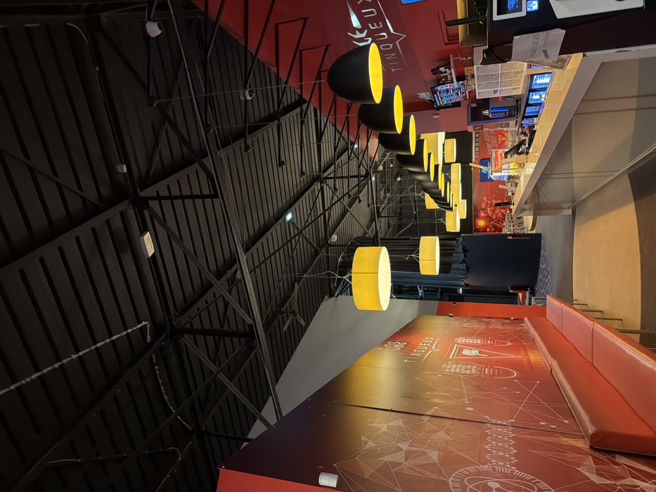 The image showcases an interior with a unique architectural design. The ceiling features a dark, metallic framework, contrasted by a row of hanging pendant lights with yellow hues. Below, a seating area is visible, displaying an intricate design pattern. The photograph also captures a glimpse of a bar area in the background, suggesting a lounge or entertainment venue.