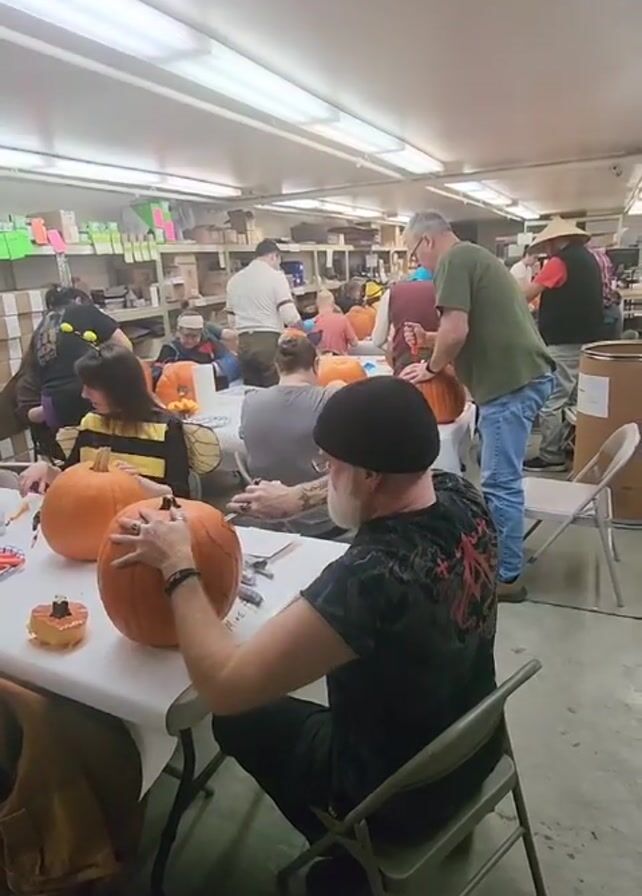 A room filled with people sitting around tables and carving pumpkins. Some are standing and walking around. The tables are covered with white paper and each person has a pumpkin in front of them. There are tools on the tables as well. Shelves filled with boxes line the back wall. The room has fluorescent lighting. One young person is dressed as a bee.