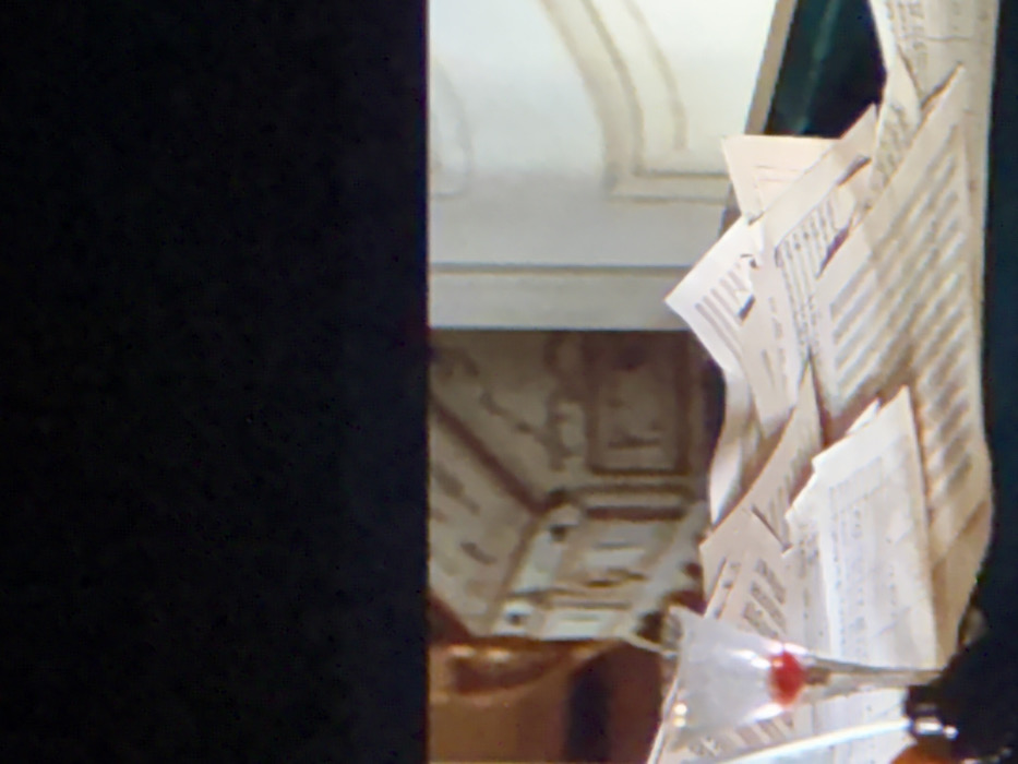 This image depicts an indoor scene located in Huixquilucan de Degollado, Mexico. The foreground features a dark surface, consistent with a desk, covered by numerous white sheets of paper arranged in a loose, scattered manner, many displaying printed or handwritten text. On the left side of this surface, a clear, stemmed glass contains a small quantity of red liquid. Adjacent to the glass is a dark, cylindrical inkwell, from which a white quill pen protrudes vertically. In the mid-ground, behind the desk, a piece of furniture upholstered in a light-colored fabric with a patterned design is partially visible. To the right of this furniture, a light-colored architectural element with a distinct curved design, likely part of a wall or column, is present. The upper portion of the image is completely obscured by a solid black bar. No individuals are visible.