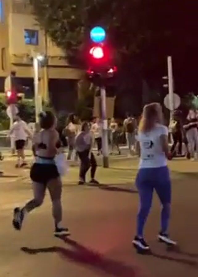 At night, a group of runners jogs across a street intersection while the traffic light is red. They wear athletic attire and some have race numbers on their chests. Other pedestrians are also seen crossing, including one man carrying a pizza box. Street lamps illuminate the scene. The intersection is in an urban area, with buildings visible in the background.