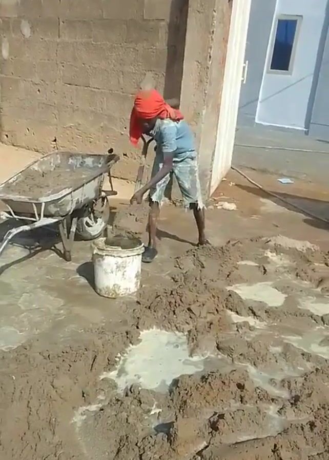 The video depicts two individuals engaged in construction work outdoors. One person, wearing a blue shirt, light-colored shorts, and a red head covering, is using a shovel to mix mud on a concrete surface. A white bucket sits near the mud, and a wheelbarrow filled with material stands to the side. The second person, dressed in a patterned shirt and blue shorts, is seen walking across the scene. The background includes a brick wall, a tall rectangular structure with a white door, and a portion of a building with a blue-tinted window. The environment is well-lit, suggesting it is daytime, and the ground shows signs of previous mixing activities.