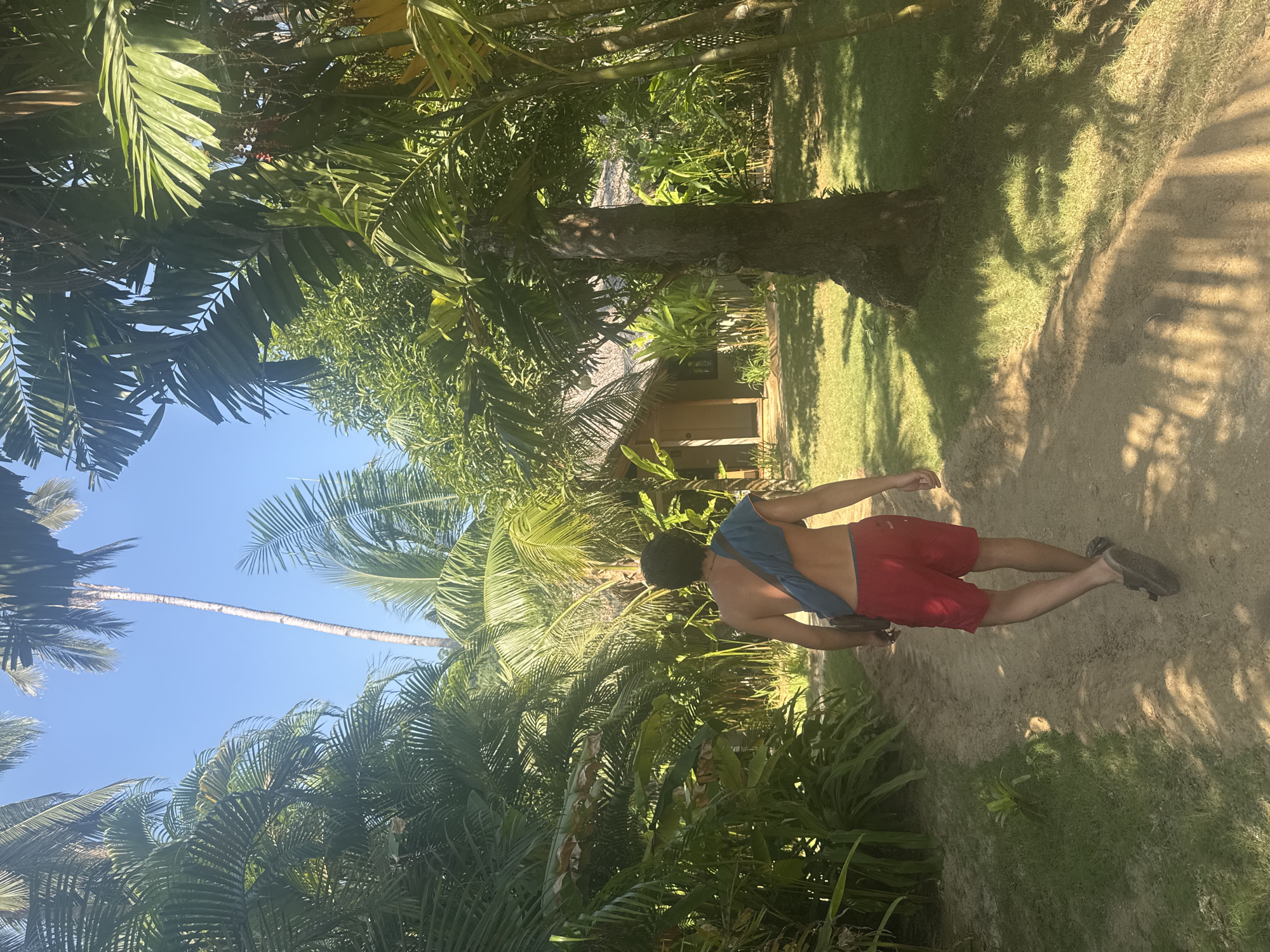 A partially-nude, medium-skinned male in red shorts walks on a tan dirt path in a tropical environment, carrying a blue bag over his shoulder, underneath a blue sky. Lush, green tropical foliage, including palm trees, surrounds the path. A small, tan-colored structure with a thatched roof is visible in the background. The image was taken in El Nido, Philippines.
