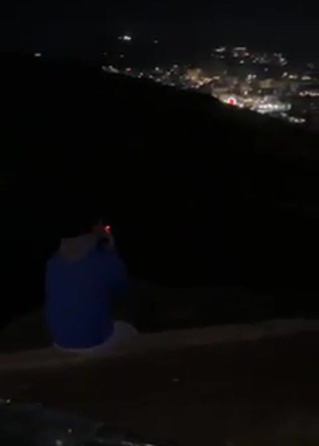 A video shot at night shows a person sitting and facing a city below from an elevated vantage point