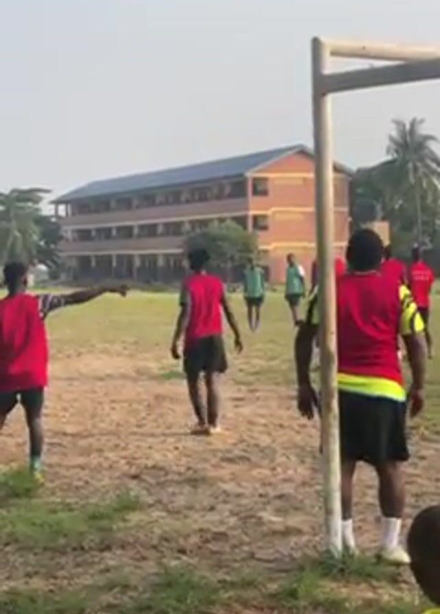 soccer game being played on a dirt field. There are several players wearing red vests and black shorts, and others wearing green shirts and black shorts. They are near a white soccer goalpost. One of the players kicks the ball, and the players start running down the field. In the background is a multi-story building with a brick and yellow facade and several windows. There are also trees and a tall communication tower in the distance. The sky is bright and clear. A person is holding a smartphone in the foreground, presumably recording the game.
