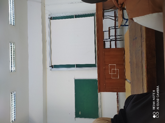 A classroom displays an overhead projector screen next to a wooden podium. A green chalkboard is positioned on the wall below the projector screen. Several chairs with metal frames are visible behind the podium. The room's interior is brightly lit, as indicated by the elongated windows on the left wall. The image also shows a partially obscured view of students in the foreground.