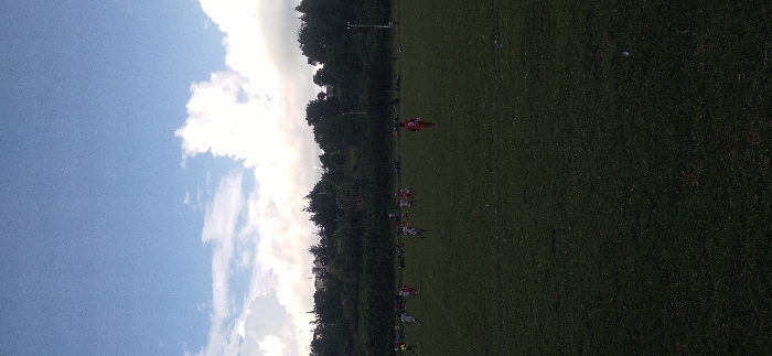 A slightly rotated outdoor shot features a grassy field with what appears to be a soccer game in progress. Several players are visible in the center of the field, some wearing light-colored uniforms and others in red. Trees line the side of the field, and the sky above is a mix of blue and white clouds. The overall lighting suggests it's daytime.
