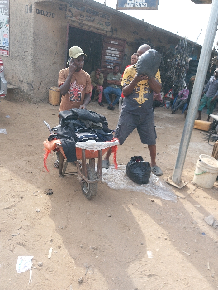 street scene with several people. One man is on a cell phone next to a wheelbarrow piled with clothes. Another man holds a black bag to his face. There are several other men sitting or standing in the background near a building with signs. One sign lists car brands "TOYOTA NISSAN MAZI" and a phone number, while another sign reads "PSALM: 121/123". The building's exterior appears worn, and the ground is dirt and debris.