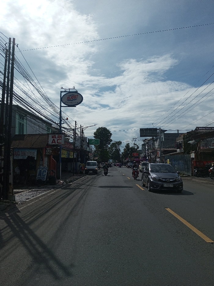 This image captures a wide-angle view of a bustling urban street in Domphoog_Dungkarchhoeling, Bhutan, under a partly cloudy sky. The perspective is from the left side of the road, looking down a two-lane asphalt street with visible tire marks and dark stains. A yellow dashed line marks the approximate center of the road. On the left side of the street, multiple utility poles are present, supporting a dense, intricate network of black overhead power and communication lines that extend across the frame. Commercial buildings line this side of the road, featuring various storefronts. One building displays a red sign with "MILAN AC" in white lettering, partially obscuring "SERVIS TV DVD RADIO KULKAS" below it. Another, more prominent oval-shaped blue and white sign, mounted on a tall pole, reads "PLANET BAN" with smaller text below it. Further down the street, a white van is parked or slowly moving near the curb. Shadows from the utility poles and wires are distinctly cast across the pavement and the left lane of the road, indicating the sun's position. Several motorcycles, some with riders, are present on this side. The right side of the street also features commercial buildings, some with metal barricades or fencing at ground level. A green sign for "J&T EXPRESS" is visible further down this side. Traffic is moving away from the viewer, including a dark grey Honda Mobilio car (license plate F 1539 TA) in the foreground of the right lane, and multiple motorcycles, each with a single rider wearing a helmet, proceeding down the street. In the distance, more vehicles and buildings are visible, suggesting continued urban development. The overall environment is one of active daytime city traffic and commerce.