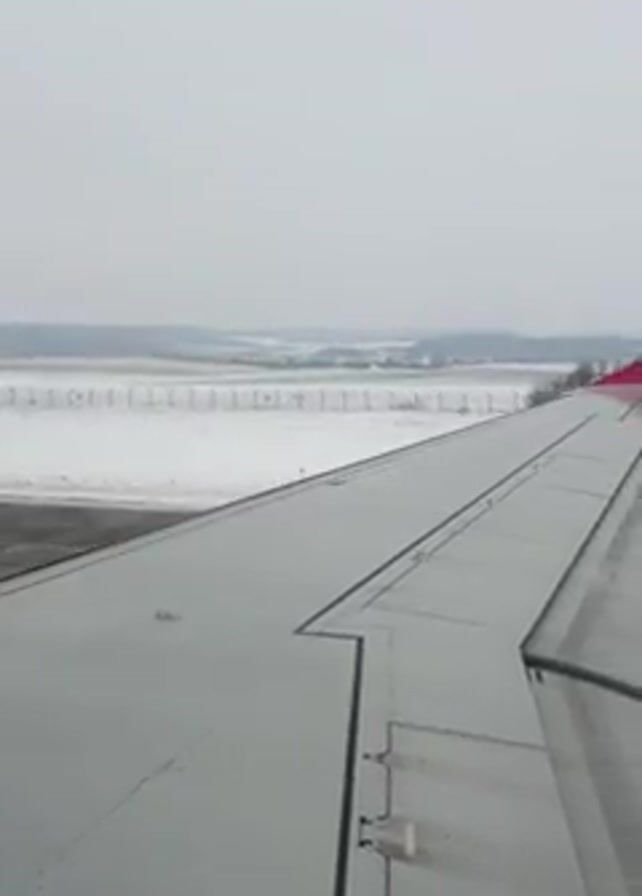 view from an airplane window, focusing on the wing of the plane. The wing is light gray and has several panels and hinges visible. Outside the window, the ground is covered in snow. There is a runway visible, and in the distance, there are hills or low mountains also covered in snow. The sky is overcast and gray. There are no people visible in the video. The plane appears to be stationary on the ground. The video is stable and does not have much movement.