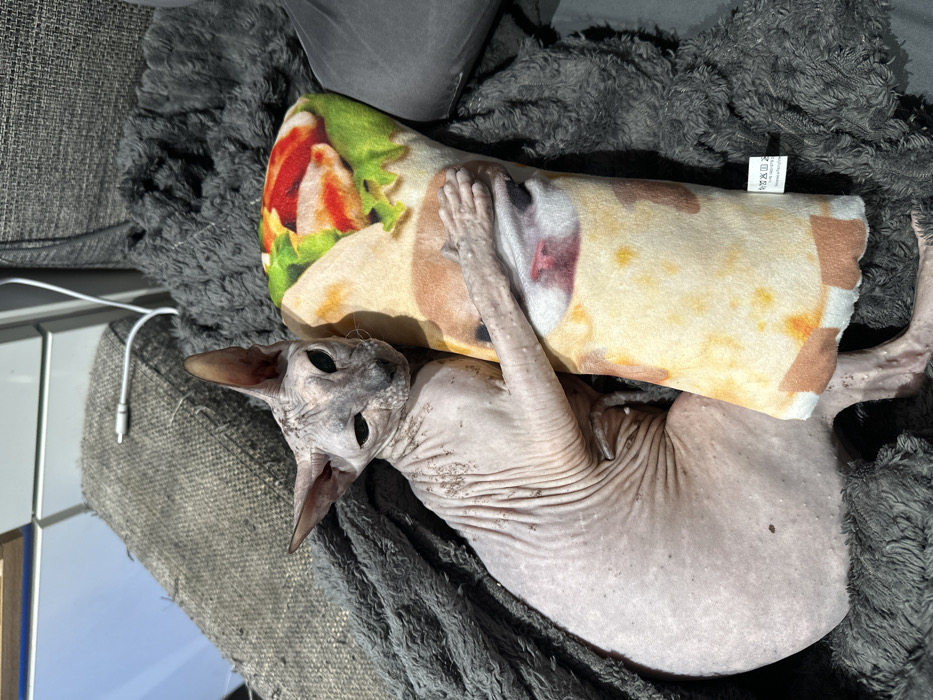 - "A hairless Sphynx cat is observed indoors in Khimki, Russia, positioned on a dark grey textured blanket covering a piece of furniture" by FM-3Dhpl2, licensed under CC BY 4.0
