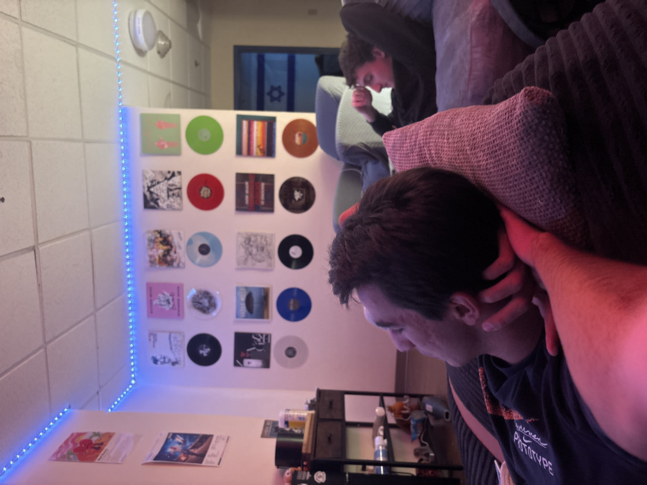 Two young men lounge on a couch. One sits further back, focusing on something in their hand. The other, closer to the viewer, rests their head on a pillow. Behind them, a wall displays a collection of vinyl records. An Israeli flag hangs in the open doorway, illuminated from within. A small table holds miscellaneous objects, and a strip of blue LED lights runs down the left wall. The lighting suggests a relaxed, intimate atmosphere.