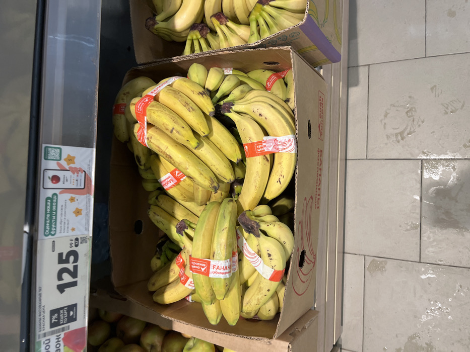 This image depicts a retail produce section within a grocery store located in Shevlyakovo, Russia. The primary subjects are multiple cardboard boxes containing pre-packaged bananas. The bananas are predominantly yellow to light green, with some displaying minor brown blemishes, and are bundled together with red and white plastic bands labeled "БАНАНЫ ФАСОВАННЫЕ" (Bananas Pre-packaged) in Cyrillic. Above the banana display, a shelf-edge sign shows a price of "125" (presumably rubles), designated for "БАНАНЫ ФАСОВАННЫЕ 1КГ" (Bananas Pre-packaged 1KG), with a smaller "99 ₽" also visible. The sign further advertises "7% КЕШБЭК ПО КАРТЕ" (7% cashback with card) and includes a section prompting customers to "Оцените наши ФРУКТЫ и ОВОЩИ" (Rate our FRUITS and VEGETABLES), featuring an image of a smartphone application with star ratings and a QR code. To the left, another cardboard box is partially visible, containing green and yellow apples. The floor consists of light-colored, possibly grey, rectangular tiles, which exhibit several scattered wet patches and indistinct smudges or footprints. No individuals are present in the frame.