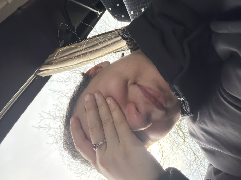 A close-up, low-angle photograph depicts a single individual, presumably female, inside a passenger vehicle, likely a bus or coach, located in Bouxwiller, France. The individual, with dark, short hair and fair skin, is positioned centrally, facing slightly upwards towards the camera. Their right hand is placed over their eyes and upper forehead, completely obscuring their eyes. A faint, closed-mouth smile is visible on the lower half of their face. A silver-colored ring featuring a prominent heart-shaped red gemstone surrounded by smaller clear stones is worn on the ring finger of the right hand. The individual is wearing a dark, possibly black, collared jacket. The background inside the vehicle shows a dark overhead panel and a light-colored, pleated curtain partially visible on the right side, pulled back from a window. A horizontal metal rail is present above the window. On the far right, the patterned upholstery of a vehicle seat (grey with a speckled or square design) is partially visible. Through the window, an overcast, bright sky is seen, against which numerous bare, deciduous tree branches are silhouetted, indicating a leafless state. No other specific geographical markers for Bouxwiller are present within the visual frame beyond the contextual information provided.