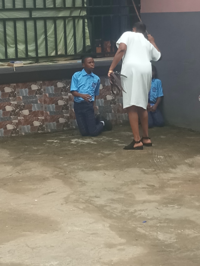 The scene depicts an outdoor area, possibly a schoolyard or courtyard, in the city of Unknown, Unknown. Three individuals are present on an uneven light-colored concrete surface. An adult female stands with her back to the viewer, wearing a white knee-length dress and dark sandals. She holds a dark strap or belt in her left hand, and her right arm is slightly raised. Facing her are two young individuals, both kneeling. The young male on the left wears a light blue short-sleeved uniform shirt with an emblem on the chest, dark trousers, and dark shoes with white socks. He looks upwards towards the adult. A second young individual, similarly dressed in a light blue uniform, kneels to the right, partially obscured by the standing adult. The background on the left features a low wall with multi-toned geometric tiles, topped by a dark metal fence and a green tarp. The background on the right is a plain dark gray wall.
