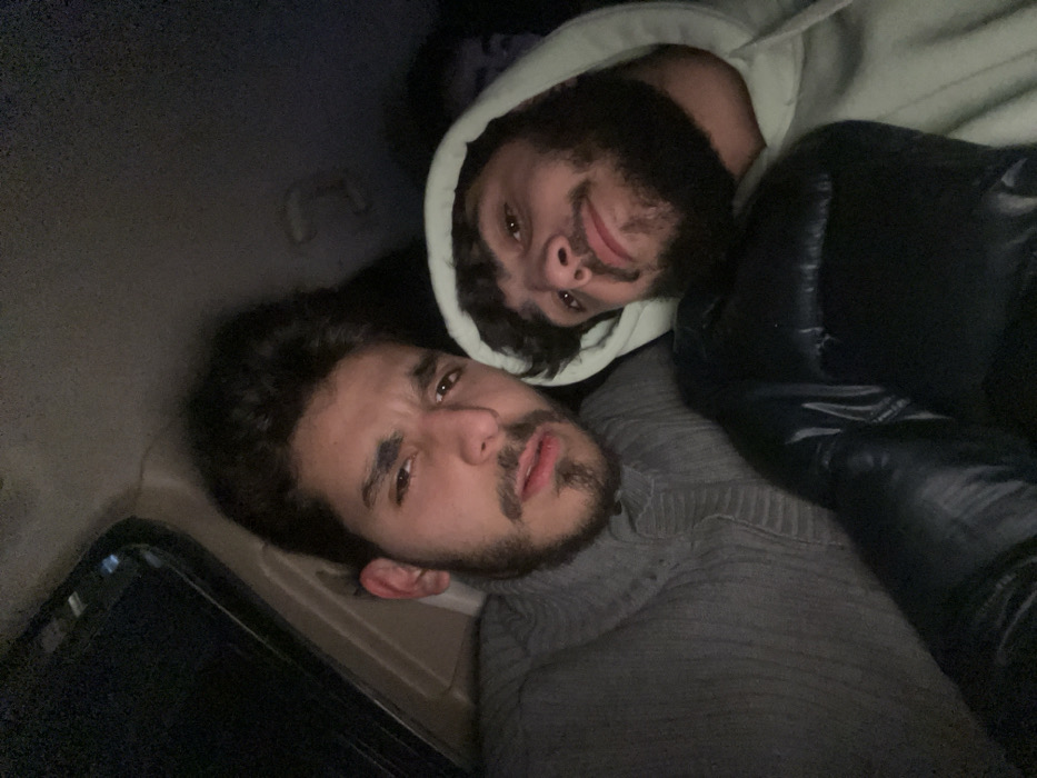Two bearded men are lying down, closely situated. The man at the bottom has dark hair, a stern expression, and wears a grey sweater. The other man, above, has dark curly hair, a light green hoodie, and is smiling slightly. Part of a black, puffy jacket is also visible. They both appear to be lying in the dark within an enclosed space, possibly a car. A cell phone is present in the image's lower-left corner.