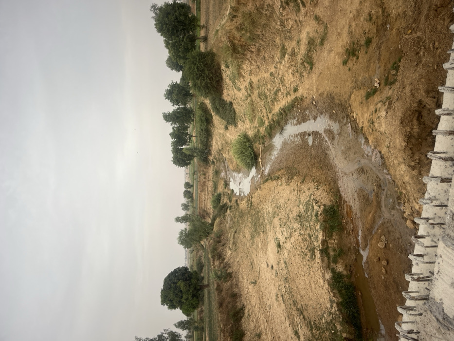 A landscape scene under a cloudy sky, featuring a dry riverbed snaking through arid terrain. Sparse vegetation dots the landscape, with trees lining the horizon and patches of green along the riverbanks. The riverbed contains stagnant, muddy water. A concrete structure with protruding rebar occupies the right edge of the frame. The overall impression is of a drought-stricken area.