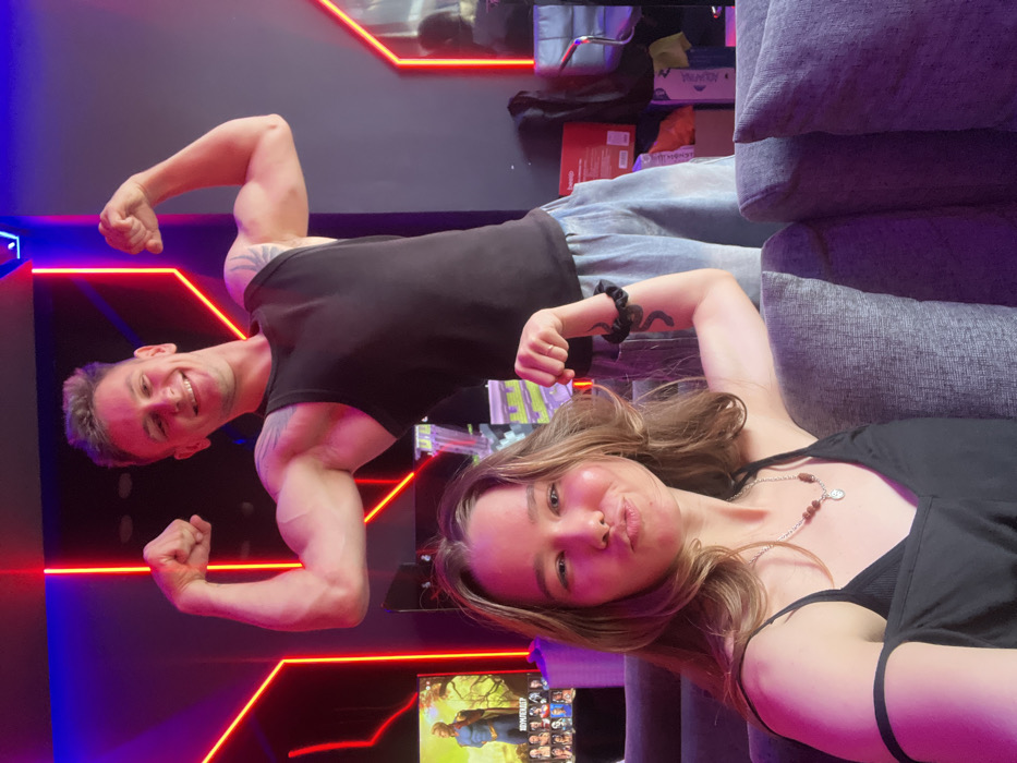 An indoor photograph depicts a young adult female and a young adult male posing. The female, with light brown hair and wearing a black spaghetti strap top and a silver necklace with brown beads, is seated on a grey upholstered sofa in the foreground. She faces the camera, flexing her right bicep and forming a 'duck face' with her lips. A black scrunchie is on her right wrist. Behind her, the male, with short light brown hair, wearing a black tank top and light blue denim shorts, stands smiling at the camera, flexing both biceps. Tattoos are visible on his upper arms. The background consists of dark walls with red and blue neon strip lighting forming geometric patterns. On the left, a screen displays an image resembling Homelander from 'The Boys,' accompanied by the Russian word 'НЕУЯЗВИМЫЙ' (Invincible) and smaller character portraits. The right background includes a partial reflection and stacked boxes. The setting suggests a modern entertainment or gaming venue, consistent with facilities found in tourist areas such as Nha Trang, Vietnam, potentially catering to a Russian-speaking demographic as indicated by the screen's text.