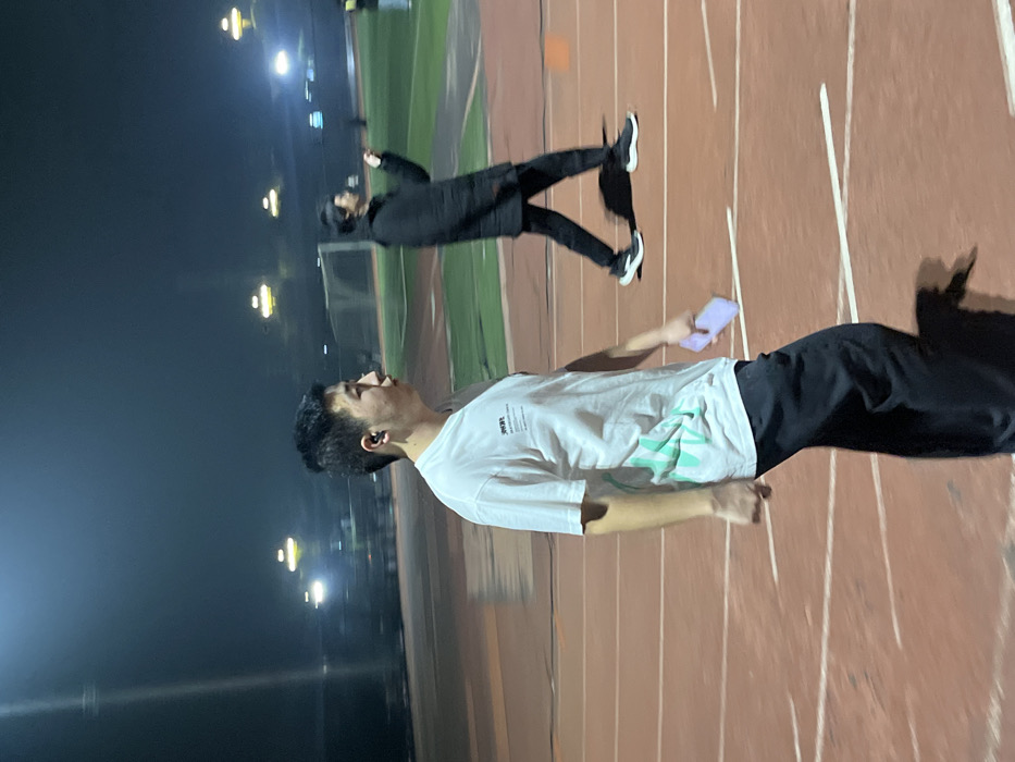 The image depicts an outdoor athletic track at night in Jiangjin, China