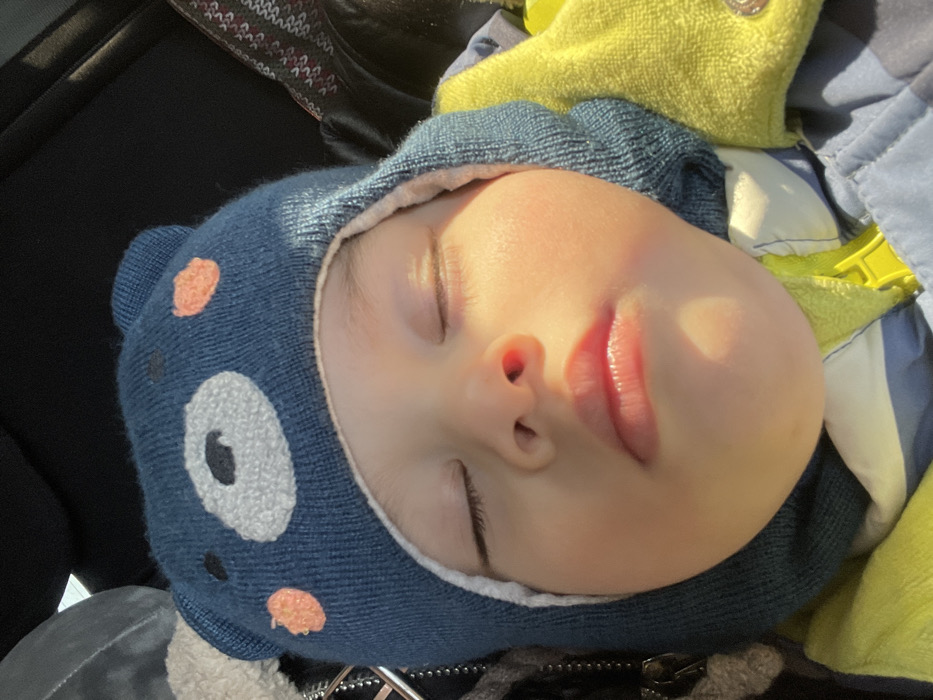 A young child is depicted sleeping, with eyes closed, in what appears to be a vehicle interior