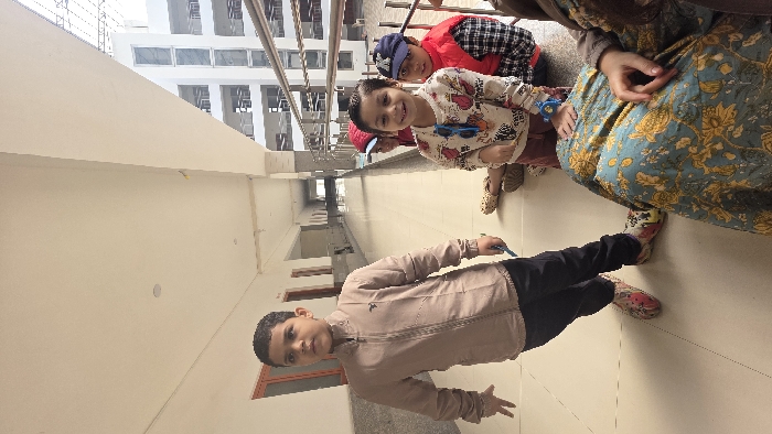 A group of children and an adult are in a hallway. A boy in a tan jacket and black pants stands in the foreground, holding a blue pen. Behind him are other children, one wearing a blue hat and red vest and another with a patterned sweater. The adult, with a patterned dress, is seated to the right. The hallway is brightly lit, with stairs visible in the background.