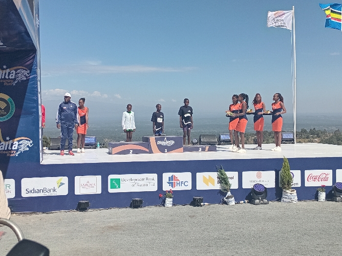 On a blue platform with sponsor logos, four women in orange dresses hold trays. Three runners stand on numbered podiums behind them. To the left, a man in a tracksuit and a woman in an orange dress stand. A white flag with writing and a blue flag wave atop a pole. The background shows a clear blue sky and a distant landscape. Plants and stage lights are at the platform's base.