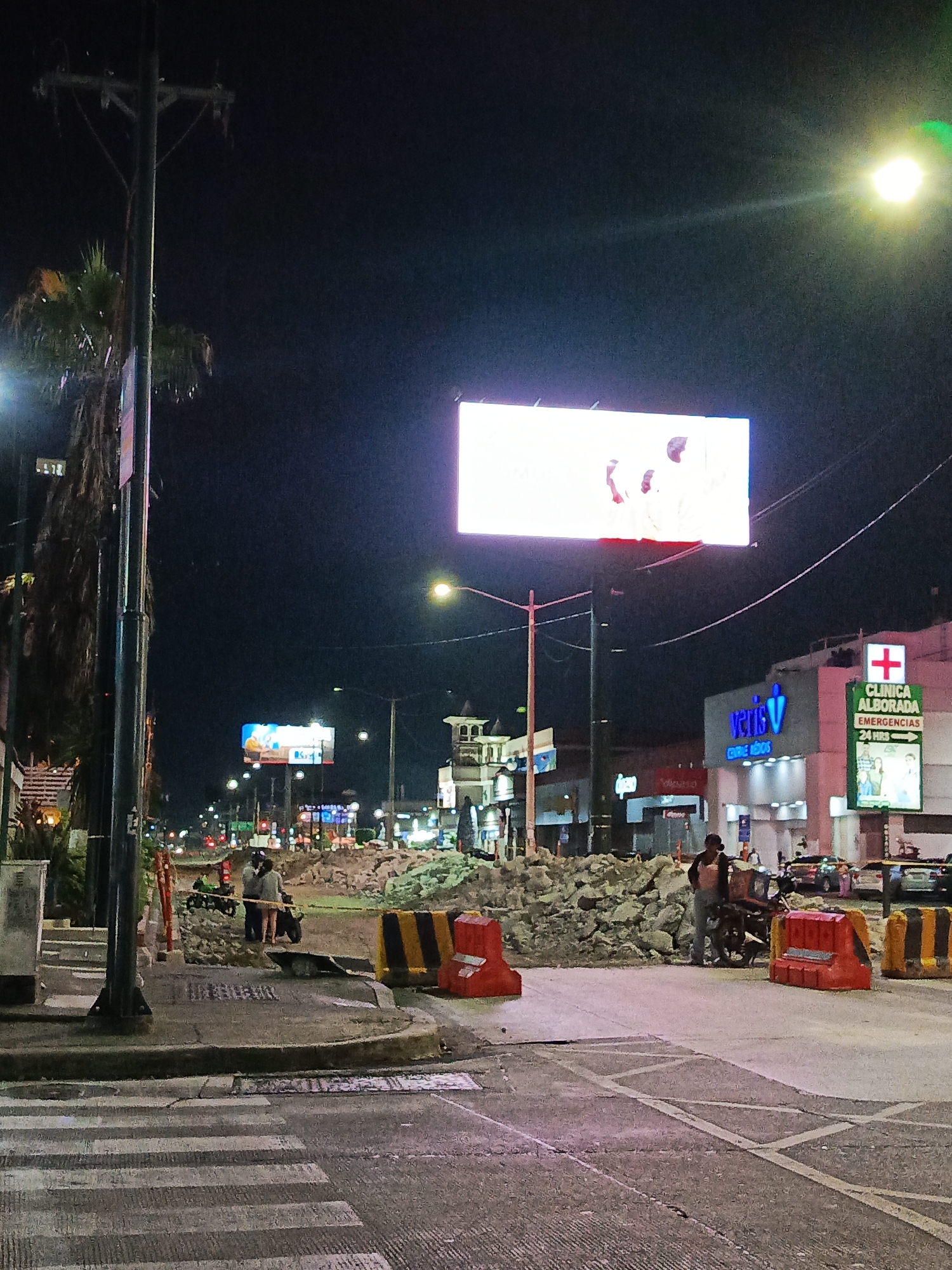 The image depicts a street scene at night in Guayaquil, Ecuador, characterized by ongoing road construction and commercial activity. In the foreground, a pedestrian crosswalk is visible. The roadway is blocked by piles of rubble and concrete barriers in alternating red and yellow-black stripes. Two people are standing to the left of the rubble pile, one near a scooter. A man with a dark jacket stands to the right of the rubble, next to a modified cart with a bicycle attached. In the background, illuminated billboards and commercial buildings are visible, including one advertising a Veris clinic. One billboard, above the Veris clinic, is lit up with the image of three people. The sky is dark, with streetlights illuminating the scene. A tall palm tree stands to the left.
