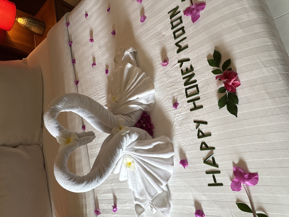 A hotel room in Ban Ao Nang, Thailand, presents a king-sized bed with white linens. Centrally positioned on the bed are two white bath towels, artfully folded to resemble swans, their necks converging to form a heart shape. Each swan is accented with small white plumeria flowers placed on its head and body. Scattered across the white bedspread are numerous small, individual purple flower petals. Below the towel swans, the phrase "HAPPY HONEY MOON" is meticulously spelled out using small, cut green plant stems or leaves. Near the foot of the bed, a small arrangement of green leaves and magenta flowers is displayed. To the right of the bed, a dark wooden bedside table supports a metallic gold-colored lamp base topped with a cylindrical red lampshade. No individuals are visible within the frame.