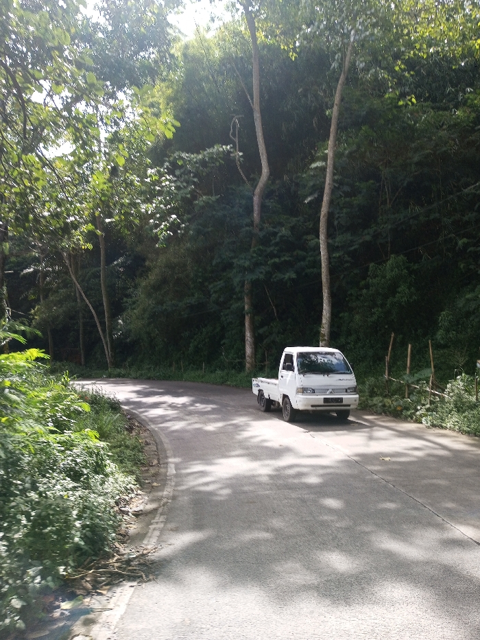 A white, compact utility pickup truck is positioned on the right side of a paved road that gently curves to the left. The road surface exhibits dappled sunlight and shadows from overhead foliage. The scene is located in a densely vegetated area, characteristic of Ariyalai, Sri Lanka. Lush green trees, including several tall, slender trunks, form a thick canopy and a wall of foliage along both sides of the road, particularly prominent on the upward sloping terrain in the background. No people are visible. The vehicle appears stationary.