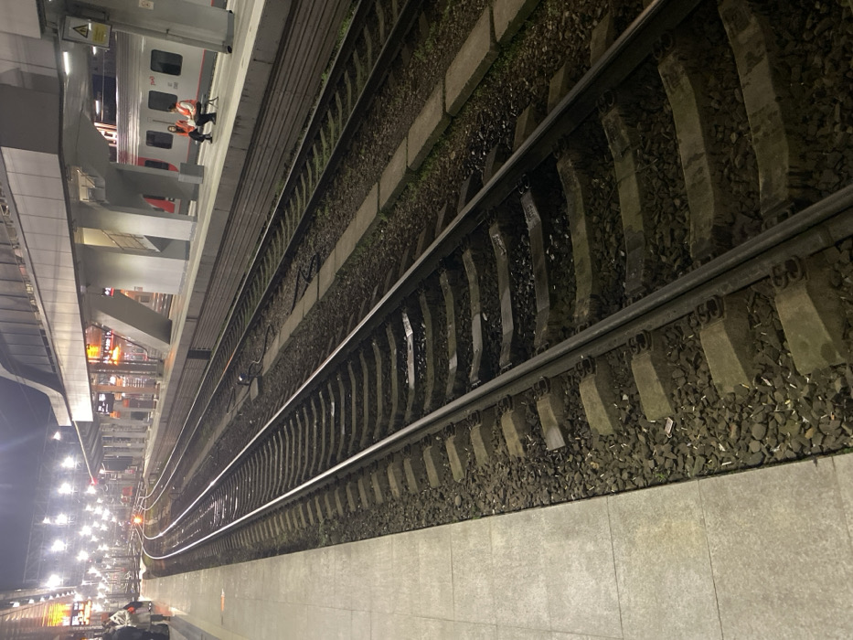A high-angle shot focuses on train tracks laid over gravel. A gray platform edge runs along the bottom right. Parallel tracks recede into the distance, curving slightly to the left. On the left, a train is visible beside a station, its exterior lit by overhead lights. Two people in orange vests stand near the train. The scene is dimly lit, with a mixture of natural and artificial light.