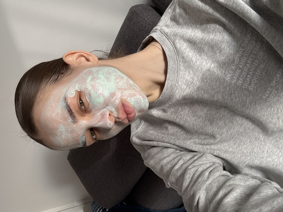 The image presents a female individual in an indoor residential setting in Warsaw, Poland. She is positioned leaning back against a dark grey upholstered surface, likely a sofa or chair. Her face is covered with a textured, light green facial mask, which appears unevenly applied with some lighter, creamy residue visible. Her hair, dark in color, is pulled back. She has brown eyes and is looking directly at the camera. Her lips are pursed in a deliberate pose. She is wearing a heather grey, long-sleeved crew-neck sweatshirt. On the right side of the sweatshirt, white printed text reads: "NIKE AND THE SWOOSH NAME AND LOGO ARE TRADEMARKS AND YOUR GUARANTEE OF QUALITY. SWOOSH®" followed by "NIKE SPORTSWEAR 1972". A delicate metallic chain is visible around her neck. In the upper left background, a portion of a blue and white patterned fabric is visible. The wall behind her is plain and light-colored. The scene is illuminated by ambient indoor light.