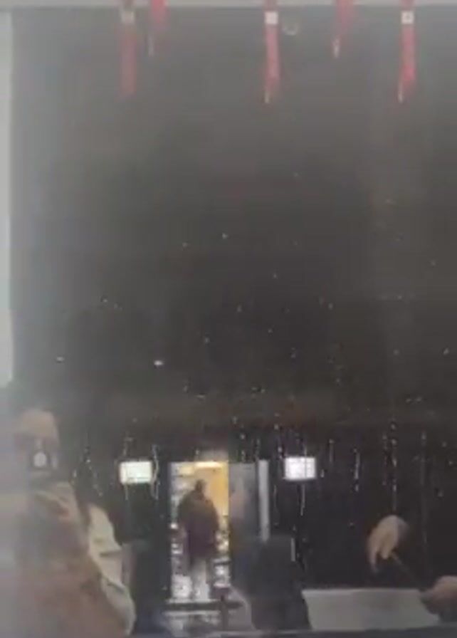 view from inside a train through a rain-streaked window. Inside, there are some people sitting and looking at their phones. Outside the train, there are blurry lights and buildings. There are red straps hanging from the overhead bar inside the train. The seats are blue with a patterned design.