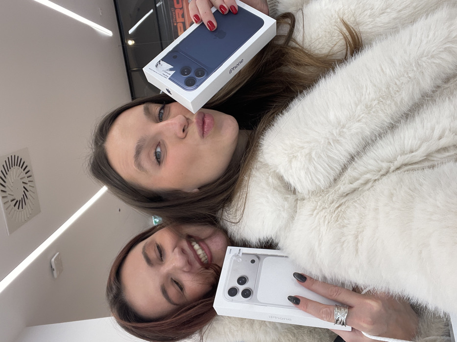 - "Two smiling young women pose together, each holding a boxed iPhone" by FM-mkWXI3, licensed under CC BY 4.0