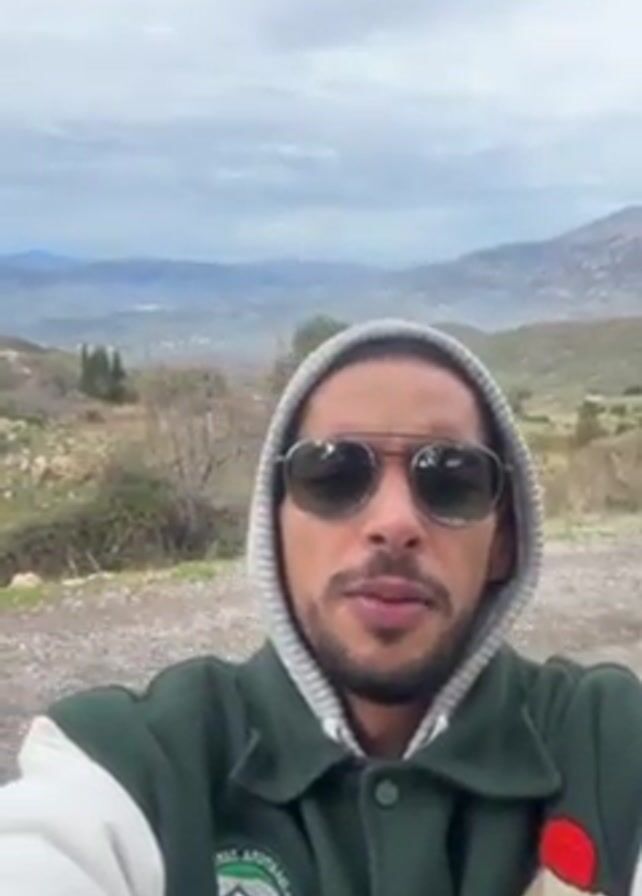 A man is recording a selfie video, standing on a dirt road surrounded by mountains and greenery. He is wearing sunglasses, a gray hoodie, and a green jacket with patches on it. He speaks directly to the camera. The background shows a cloudy sky, mountains in the distance, and scattered trees. As the camera moves slightly, a small building with blue accents becomes visible in the background.
