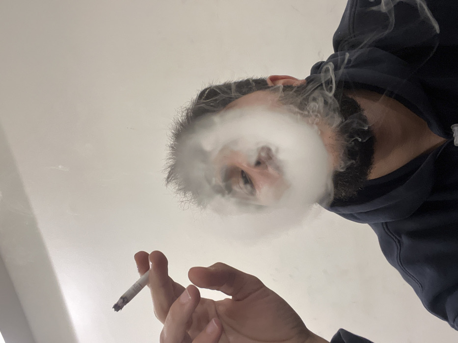 - "A low-angle shot captures a man exhaling a cloud of smoke, obscuring most of his face" by FM-NiDCC3, licensed under CC BY 4.0