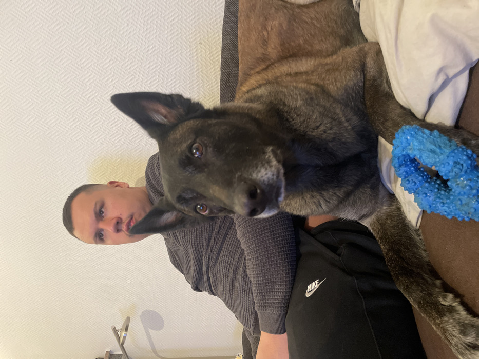 An indoor scene in a residential setting in Luxembourg, Luxembourg, depicts a male individual and a dog situated on a brown sofa. The male, an adult with short dark hair and light skin, is seated on the left side of the frame, facing left with a neutral expression. He wears a dark grey, textured long-sleeved shirt and black athletic pants with a white "Nike" logo on the left thigh. To the right of the male, a Belgian Malinois dog with brindle fur and erect ears is lying down, facing the camera with amber eyes. A bright blue, textured, ring-shaped chew toy rests on a light-colored blanket or cushion near the dog's front paws. The background features a light-colored wall with a subtle, repeating geometric pattern. A metallic lamp fixture is partially visible in the upper left corner of the frame.