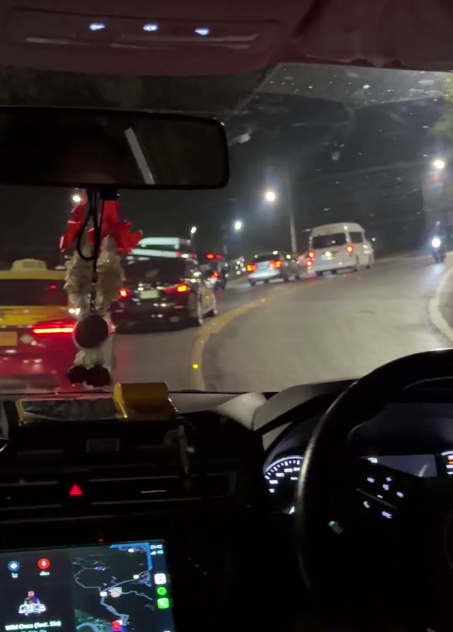 perspective of someone sitting in the driver's seat of a car, navigating a curved road at night. Headlights and taillights of other vehicles illuminate the scene, indicating traffic congestion. Streetlights also provide additional lighting. The car's dashboard is visible, displaying a navigation screen and various controls. A rearview mirror and a dashcam are mounted on the windshield. A decorative object hangs from the rearview mirror.