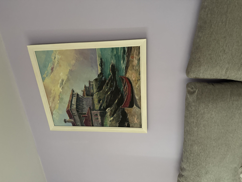 An interior scene from a location in Sofia, Bulgaria, displays a framed oil painting mounted on a light lavender-colored wall