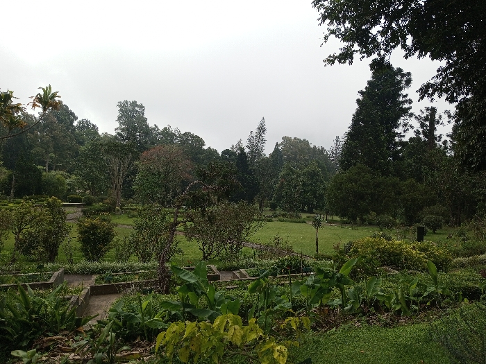 A lush, green garden with diverse vegetation. Terraced plots in the foreground, filled with plants, lead to a grassy area surrounded by mature trees. The scene evokes a sense of tranquility, accentuated by the overcast sky and hint of fog in the background. The garden's layout suggests careful cultivation and thoughtful design.
