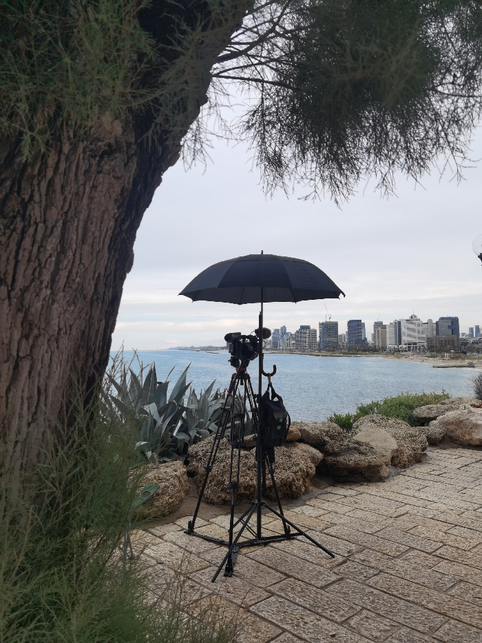 A professional black video camera, mounted on a black tripod, is positioned on a paved stone surface overlooking the Mediterranean Sea in Tel-Aviv, Israel. An open black umbrella is affixed to the tripod, situated directly above the camera. A small black backpack hangs from the tripod assembly. The immediate foreground features a large tree trunk with textured bark and green foliage partially obscuring the left side of the frame, with sparse branches extending from the top. Behind the camera setup, large light-colored rocks and several agave plants are visible. The background shows the calm blue water of the Mediterranean Sea, with the urban skyline of Tel-Aviv, including multiple high-rise buildings, visible on the distant coastline. The sky is overcast and light grey. No individuals are present.