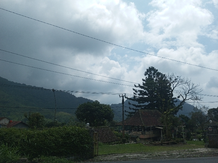A serene landscape unfolds beneath a sky of clouds ranging from light to dark. Lush green mountains form a backdrop, partially obscured by trees. Wires run across the frame, adding a human-made element to the natural scene. In the foreground, a quaint building with a red-tiled roof peeks through foliage. A utility pole stands tall beside it, connecting civilization with the tranquility of nature. A hedge and partial fence define the boundary.