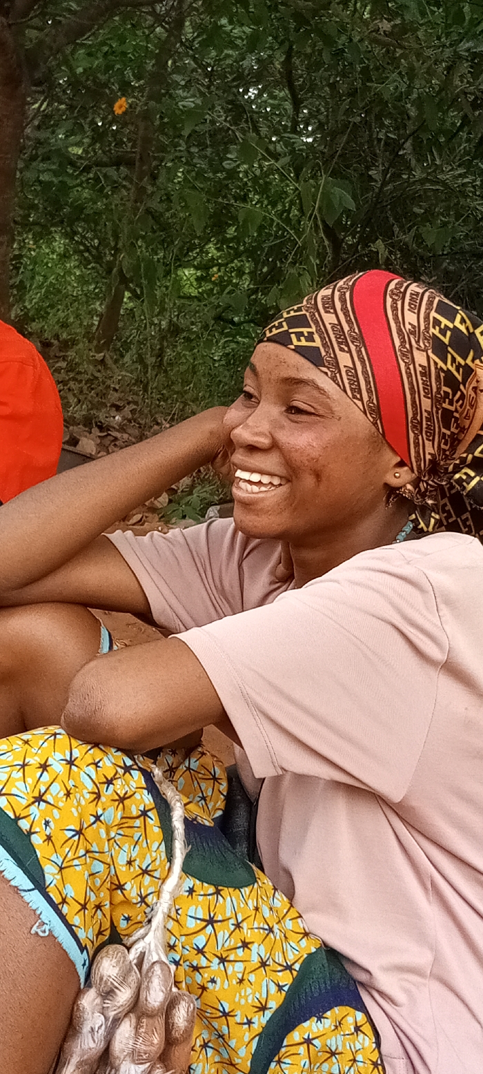 The image presents a waist-up portrait of a young adult female in the city of Unknown, Unknown. The subject, positioned slightly right of center, has dark skin and is smiling broadly with her mouth open, revealing white teeth and exhibiting dimples on her cheeks. She wears a multi-colored headscarf featuring black, red, tan, and beige sections with a repetitive "FENDI" text and chain pattern. Her attire includes a light pink/tan short-sleeved t-shirt. A blue beaded necklace is visible around her neck, and a stud piercing is present on her right ear. Her right arm is bent at the elbow, with her hand resting near her head, while her left arm is also bent, resting on her lap. On her lap, a yellow fabric with a black and light blue starburst-like pattern and a dark green border is visible. Resting on this fabric is a cluster of several elongated, light-colored objects, possibly wrapped in clear material and bound together by a thin string or cord. A portion of another individual wearing an orange garment is visible on the far left. The background consists of dense green foliage, indicative of trees and bushes, with small yellow flowers discernible within the greenery. The ground appears to be an unpaved dirt surface.