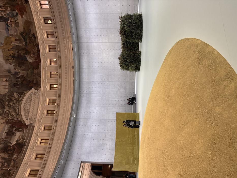 An angled shot from above shows a large, curving mound of golden material dominating the right side. Along the top is a concrete wall with two bushes and people nearby. To the left is a decorative domed ceiling with windows and painted frescoes. A gold rectangle stands in the lower center. The scene appears to be an art installation within a large, architectural space.